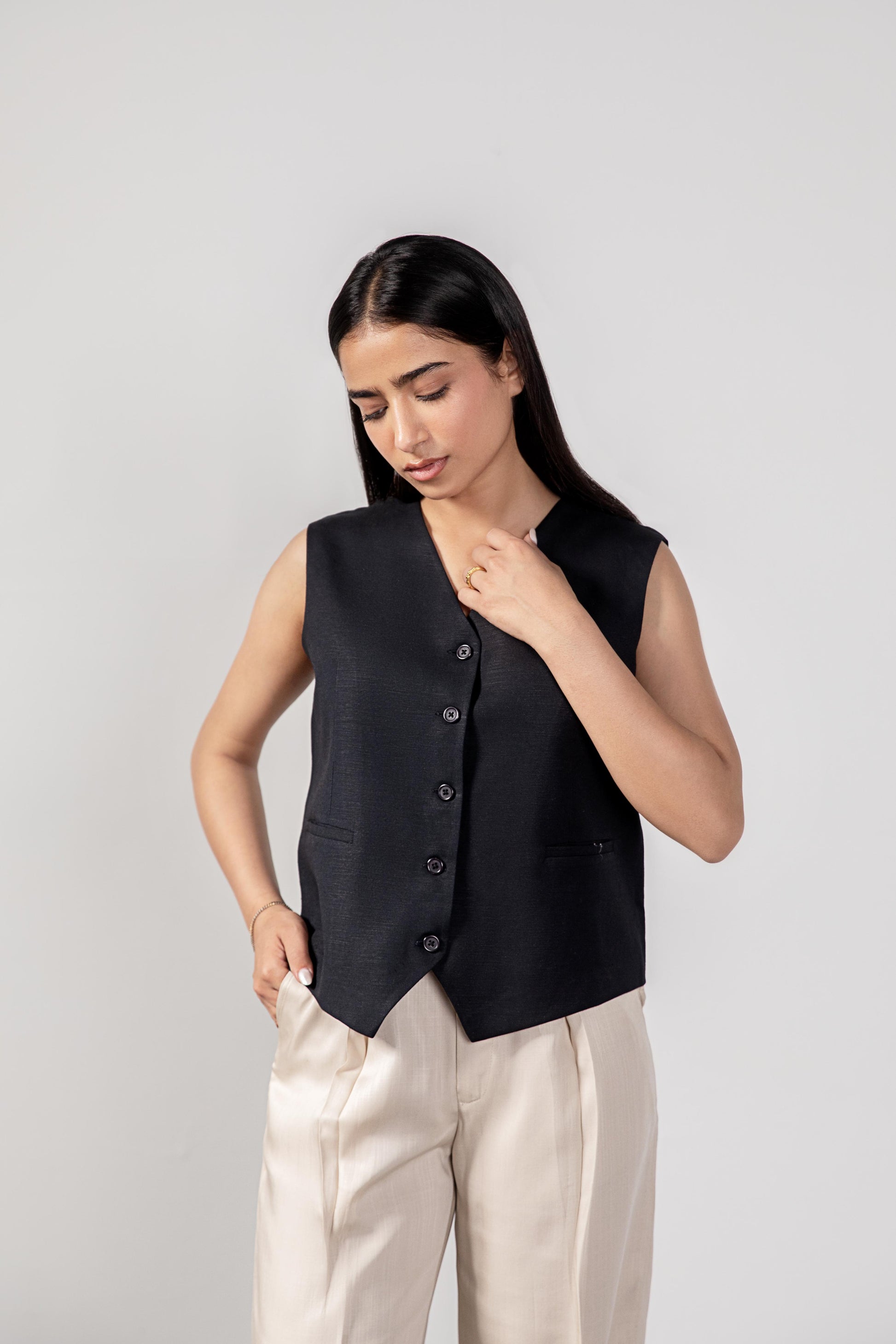 Waistcoat made of linen. V-neckline. Front welt pockets. Button-up front.