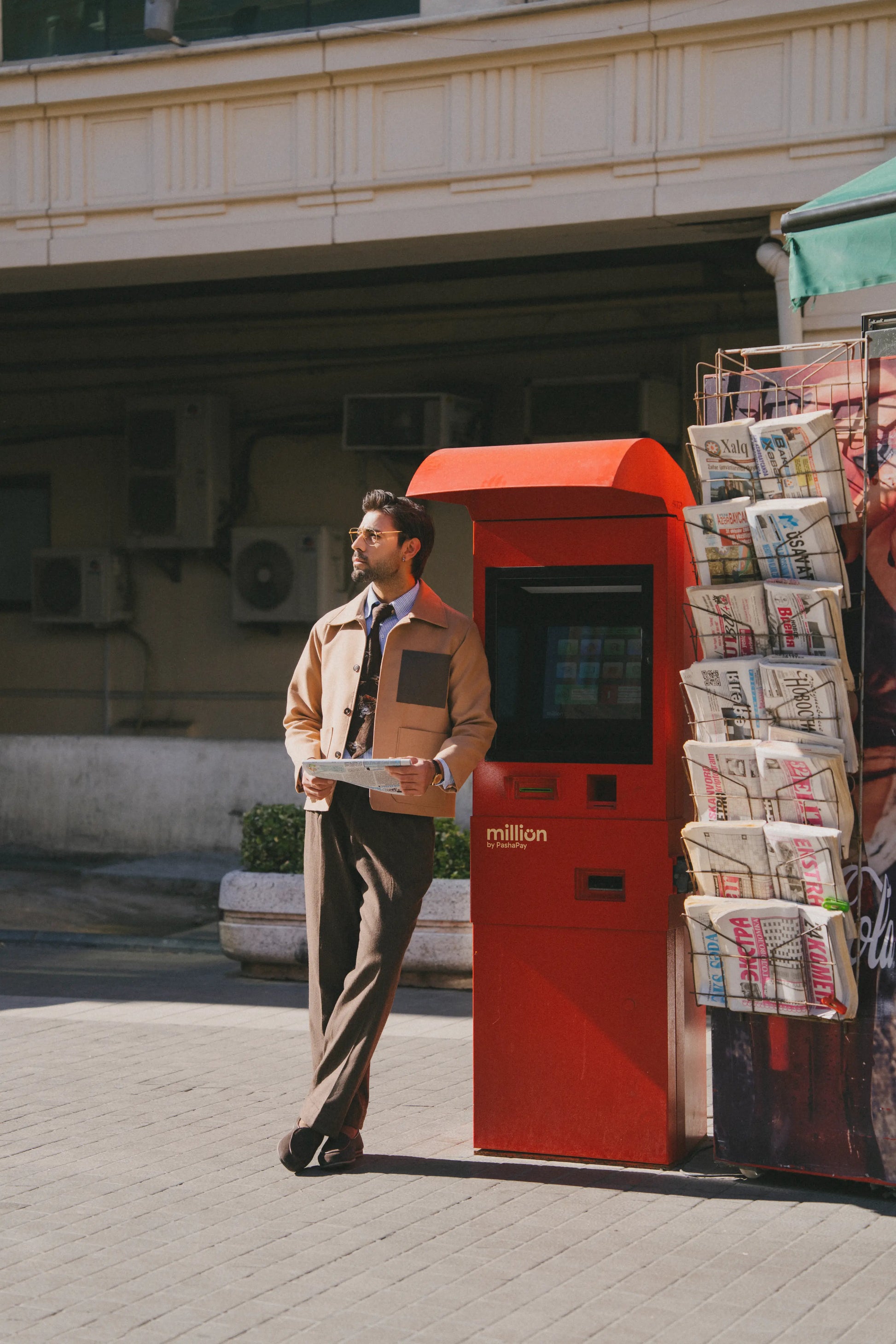 A tailored suede tan jacket featuring a bold contrasting leather-look pocket, blending refined craftsmanship with modern city style. this jacket stands out with its clean, minimalist tailoring and a strong contemporary detail: a dark contrasting patch pocket that adds structure and visual depth. Finished with polished buttons and a smooth texture, it pairs sophistication with everyday practicality.